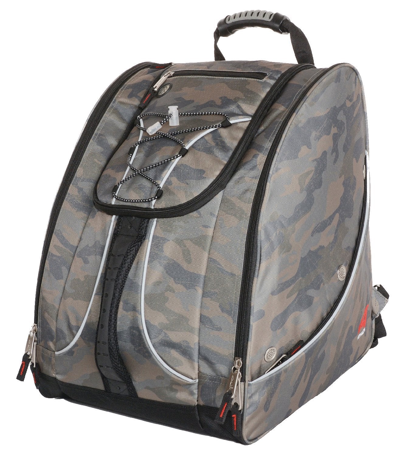 Athalon Everything Boot pack. The most comfortable, organized boot bag made today. Separate side entry boot sections. Reinforced hidden back pack straps. Expanding section for helmet. Waterproof bottom. Top and front carry handles. Front MP3 pocket w/ earphone outlet. The most comfortable, organized, and useful boot bag on the market, the Athalon Everything boot pack offers space for just about all your ski gear save your skis themselves. The bag--which includes four padded lumbar back pads for comfort and support--is outfitted with a large main compartment with separate side-entry zippered boot sections, making it easy to slip your boots inside after a long day on the slopes. You also have plenty of room for other items thanks to the large expandable pocket, which can hold a ski helmet or jacket, and the bungee cords on the front for maps, goggles, and other accessories. Perhaps the most convenient feature for frequent skiers, however, is the pair of hidden, reinforced backpack straps, which make it easy to carry the boot pack to and from the parking lot. Other features include a waterproof tarp along the bottom to keep the bag and its contents from getting wet; a vented boot section with bottom drainage grommets; clips in each pocket for gloves, keys, and other small items; a front MP3 player pocket with an exterior earphone port; top and front carrying handles; matte chrome hardware; and a contoured shape that fits your boots perfectly. Lined with reflective piping to improve visibility on poorly lit days, the boot pack carries Athalon's five-year warranty.