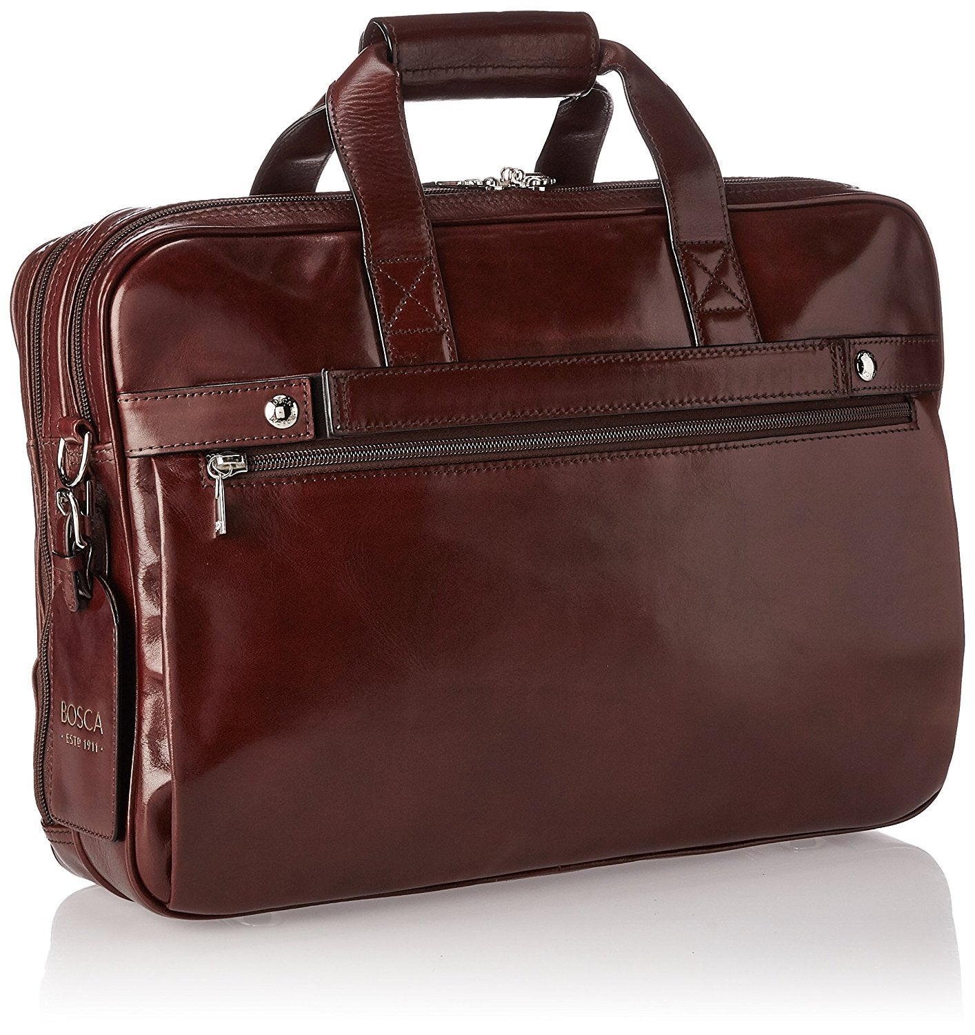 • Color:Black The laptop compartment can accommodate up to a 15' laptop. Made of soft yet rugged taconni leather. Top zip closure. Adjustable, padded shoulder strap. Roller-bag strap for easy travel. Two large, external zippered pockets. Gold-tone hardware. Zippered gusseted pockets on the front and rear. Two main compartments for the utmost in storage. Custom designed rubber feet. Luggage ID tag included.