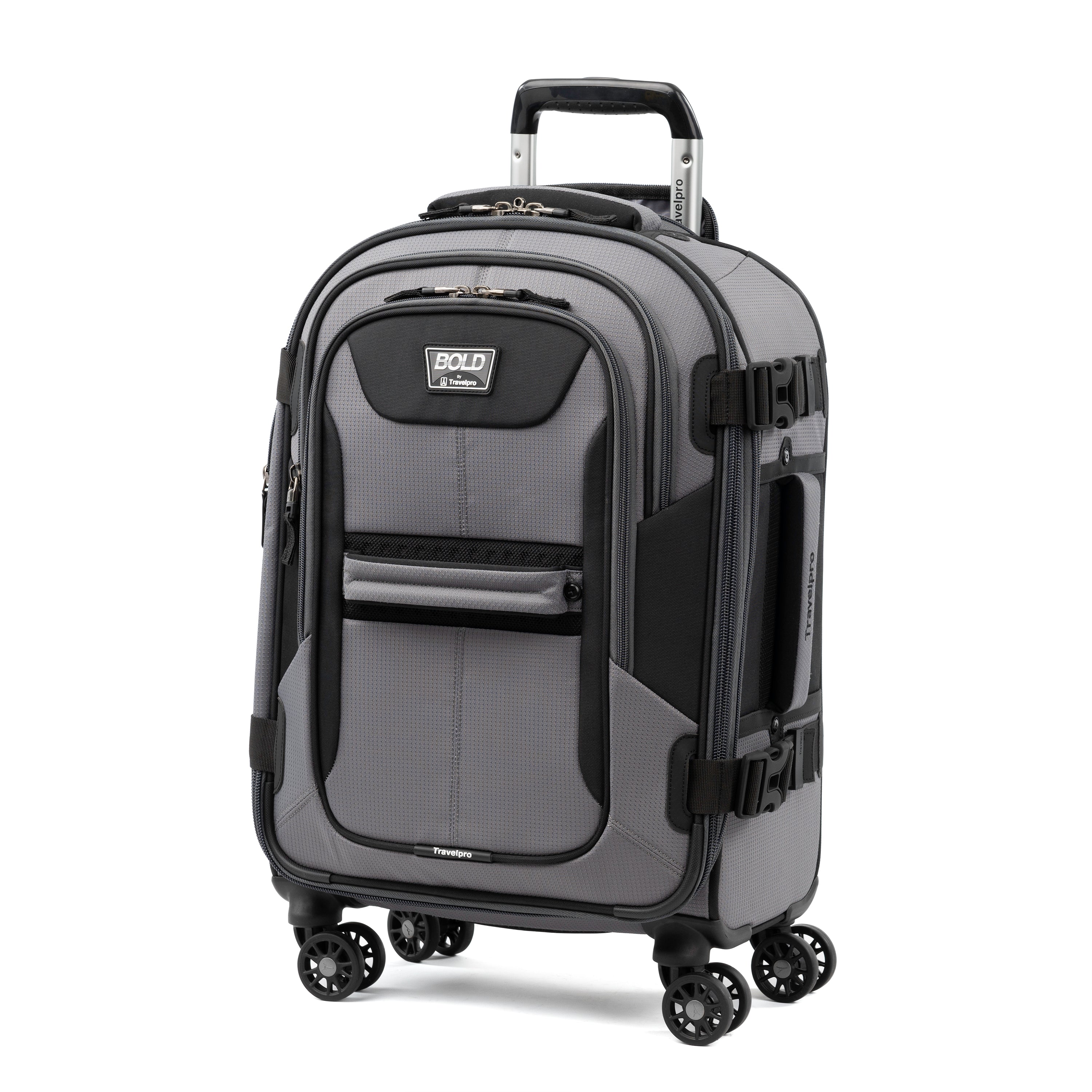 This carry-on spinner is made for action and expansion! The tough but lightweight Bold by Travelpro 21 Spinner delivers big on features in a compact carry-on that meets size restrictions for most domestic airlines and boosts packing capacity with its 2 expansion option. Smart features include a padded tablet sleeve conveniently accessible from an exterior zipper, a zippered, hidden back pocket with built-in key ring and an interior mesh pocket built into the lid. A large zippered wet pocket keeps damp or dirty items separated, hold-down straps keep everything in its place and exterior compression straps provide added security and adjust to condense the bags depth when needed.Uniquely styled and built for durability, this carry-on is made of rugged, high-density polyester fabric treated to resist moisture and stains and has reinforced wheel housings, skid guards and molded corner guards to protect high wear points. A strong, telescoping, aircraft-grade handle adjusts to users of different heights, while eight spinner wheels rotate 360 to glide over nearly any terrain. Backed by our Travelpro Built For A Lifetime Limited Warranty with the Trusted Companion Promise.