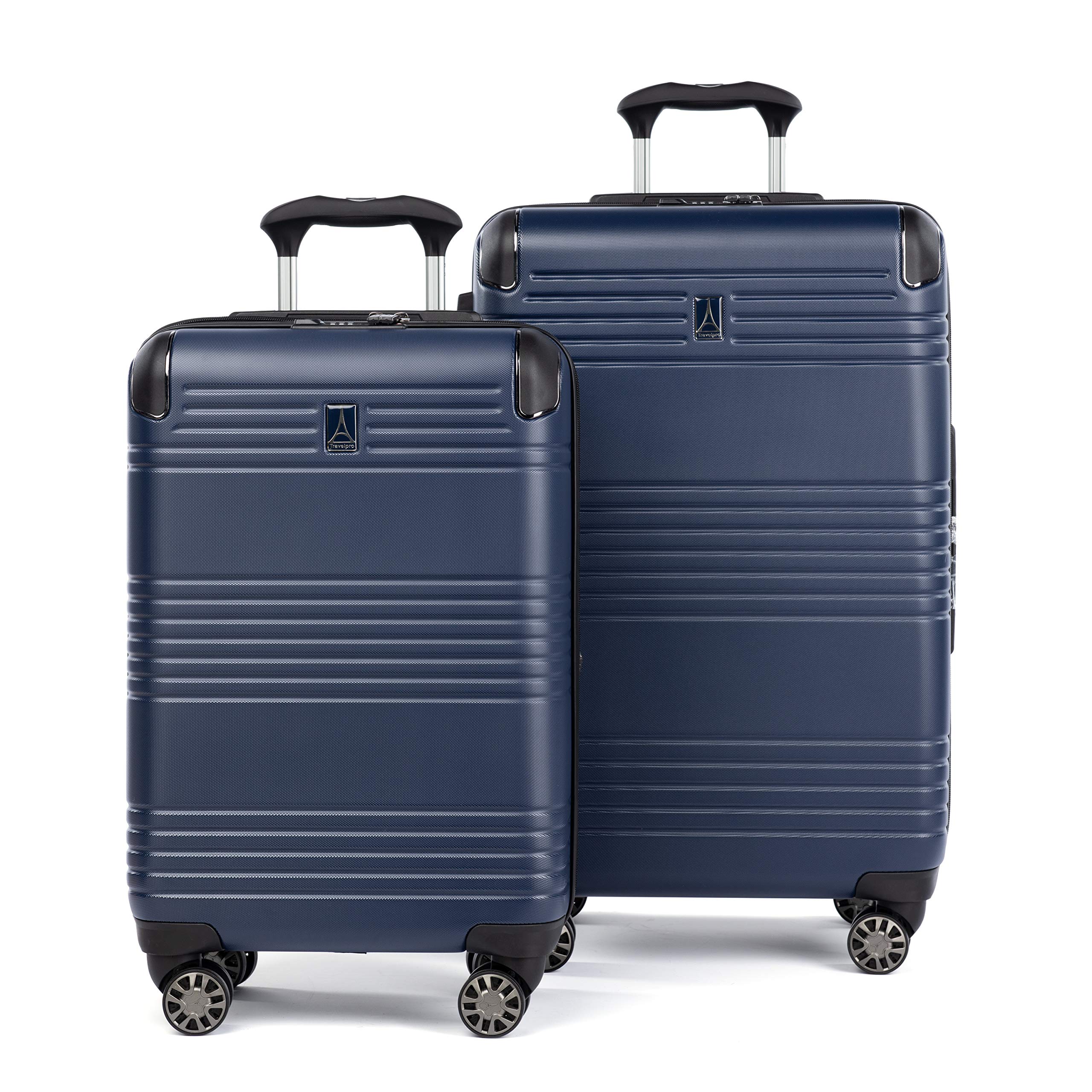 Be ready for any trip with the Travelpro Roundtrip Carry-on Expandable Spinner and Medium Check-in Expandable Spinner set. This lightweight hardside luggage features clean lines and built-in durability with 100% polycarbonate hard shells that flex on impact, molded corner guards for reinforcement on high-wear points and a stylish finish that reduces the visibility of scratches and scuffs. Split case designs include a zippered expansion option to give you up to 2 more packing capacity per bag when needed, while interior divider panels, multiple accessory pockets and built-in TSA locks keep contents separated, organized and secure.
